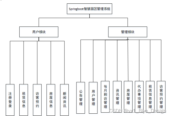 (3)确定好系统使用的技术,进行在线确认系统所划分的用户角色,并且根据用户角色划分确定所要设计的功能模块,对基于Springboot的智慧园区管理系统的设计主要划分用户角色,并所使用的功能模块也相应不同,但是系统的数据库实现的内容是交互的,用户可以随时根据自己的需求进行信息查看,对于系统工作人员可以根据自己的分管内容进行在线信息的处理及操作。