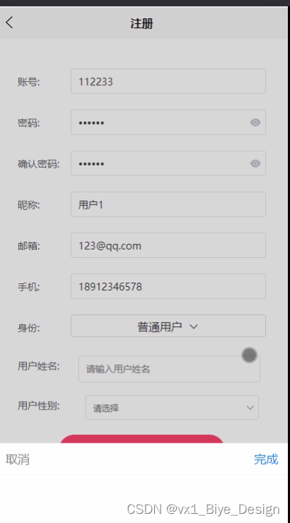 注册,通过填写账号、密码、昵称、手机、、邮箱、简介等信息,输入完成后选择提交即可注册成功,如图5-2所示。
