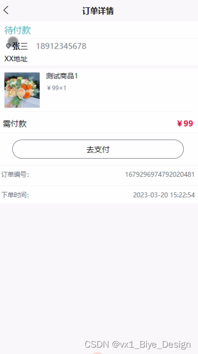 订单页面可以查看展示的鲜花详情等信息,并可根据需要进行支付等操作。如图5-5所示。