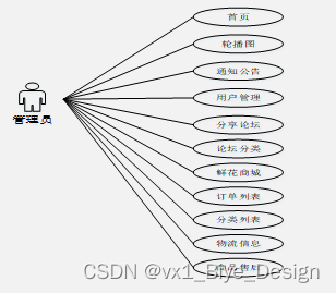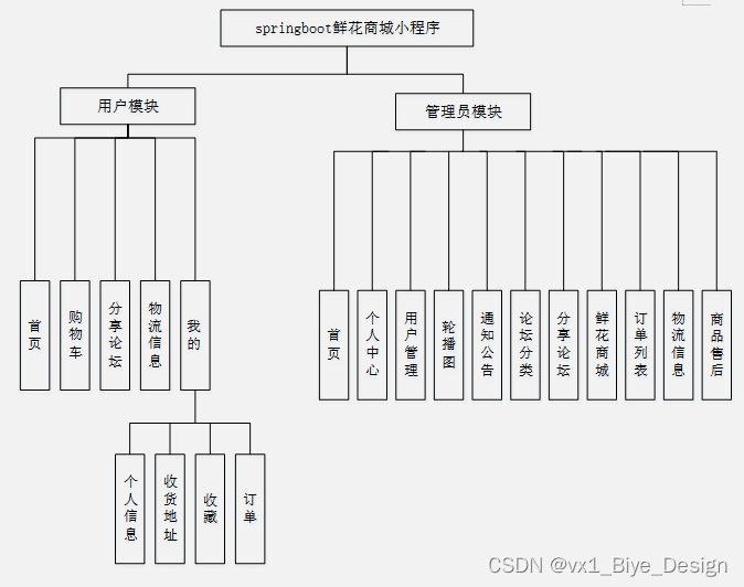基于微信小程序的鲜花商城基于现有的手机,可以实现管理员,首页、轮播图、通知公告、交流管理(分享论坛、论坛分类)商城管理(鲜花商城、分类列表、订单详情)系统用户(管理员、普通用户、卖家)模块管理(物流信息、商品售后)等详细的了解及统计分析,根据系统功能需求建立的模块关系图如下图: