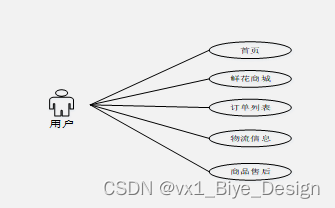 (3)确定好系统使用的技术,进行在线确认系统所划分的用户角色,并且根据用户角色划分确定所要设计的功能模块,对于微信小程序的鲜花商城系统的设计主要划分别为管理员和用户角色,并所使用的功能模块也相应不同,但是系统的数据库实现的内容是交互的,用户可以随时根据自己的需求进行课程信息,对于系统工作人员可以根据自己的分管内容进行在线信息的处理及操作,管理员获取到所有用户的详细数据信息,并根据需求进行第一时间处理解决。