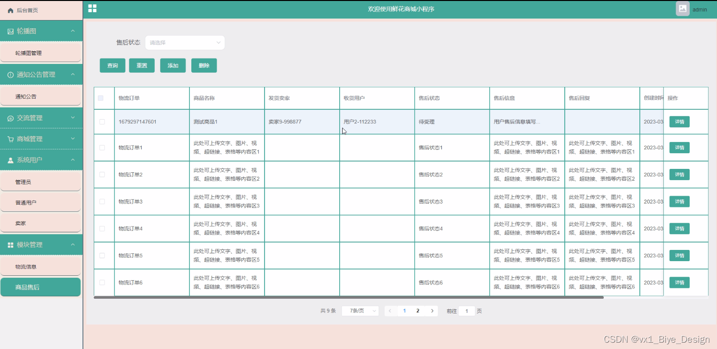 在管理员功能页面可以查看,首页、轮播图、通知公告、交流管理(分享论坛、论坛分类)商城管理(鲜花商城、分类列表、订单详情)系统用户(管理员、普通用户、卖家)模块管理(物流信息、商品售后)等内容进行相对应操作,如图5-7所示。
