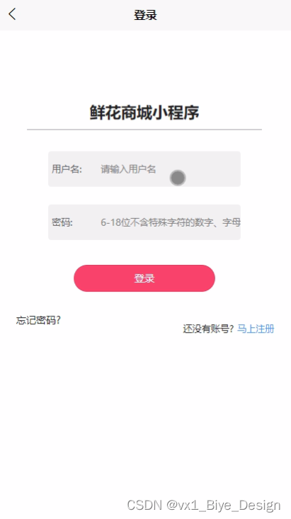 微信小程序的鲜花商城登录界面,通过填写账号、密码、等信息进行登录,如图5-1所示。
