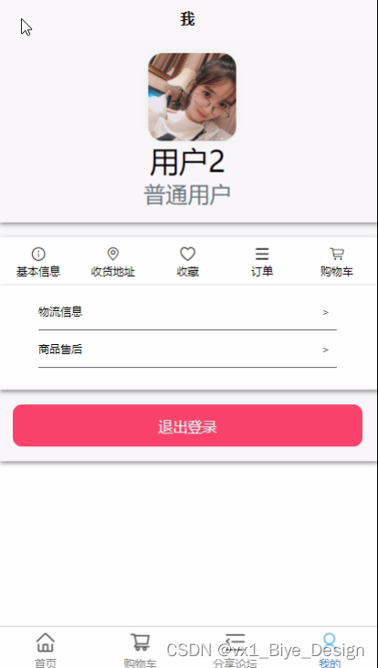 首页,可以进行首页、购物车、分享论坛、物流信息、商品售后、我的(个人信息、收货地址、收藏、订单、购物车)等功能模块的查看与操作,如图5-3所示。