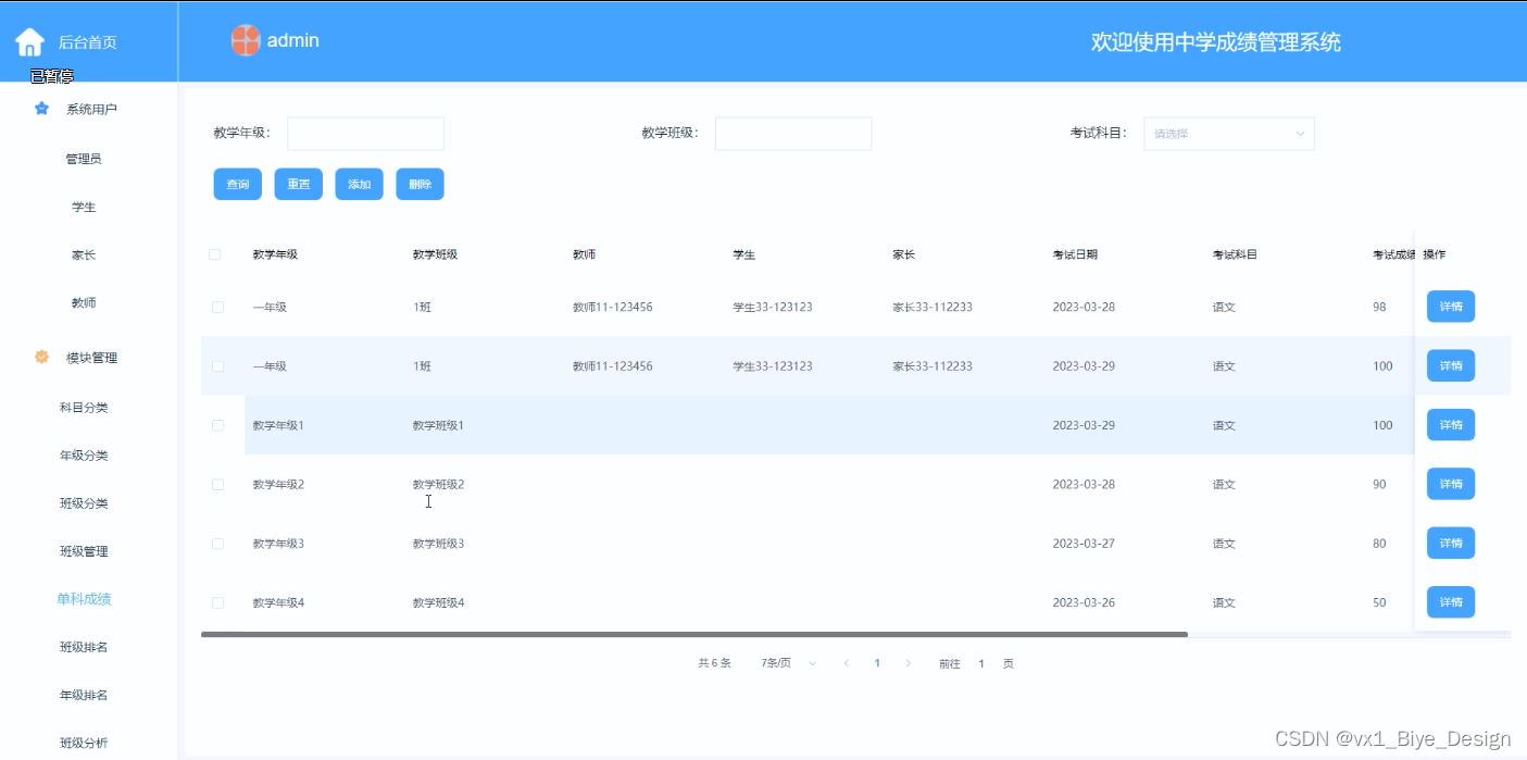 (4)单科成绩:点击“单科成绩”这个菜单,可以查看到系统中所有添加的单科成绩信息,支持通过教学年级或者教学班级对单科成绩信息进行查询,如果想要了解某一单科成绩的详细信息,点击后面的“详情”会进入详情界面;