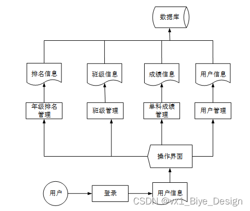 数据层(DL):由于本中学成绩管理系统的数据是放在服务端的mysql数据库中,因此本属于服务层的部分可以直接整合在业务逻辑层中,所以数据层中只有数据库,其主要完成本中学成绩管理系统的数据存储和管理功能。
