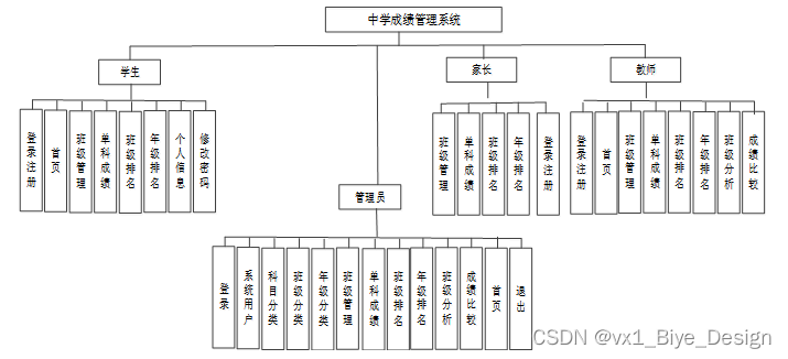 在上一章节中主要对系统的功能性需求和非功能性需求进行分析,并且根据需求分析了本中学成绩管理系统中的用例。那么接下来就要开始对本中学成绩管理系统 的架构、主要功能和数据库开始进行设计。中学成绩管理系统根据前面章节的需求分析得出,其总体设计模块图如图3-2所示。