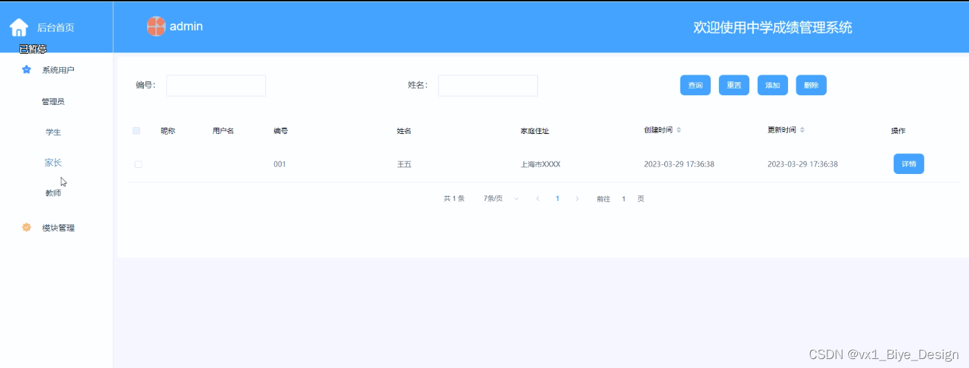 (2)用户管理:管理员可以对系统中所有的用户角色进行管控,包含了管理员、学生、家长以及教师这四种角色,如果需要添加新的用户,点击页面中的“添加”按钮根据提示输入上用户信息,点击“提交”以后在对应的用户界面就可以查看到了,可以点击用户后面的“删除”按钮直接删除某一用户。