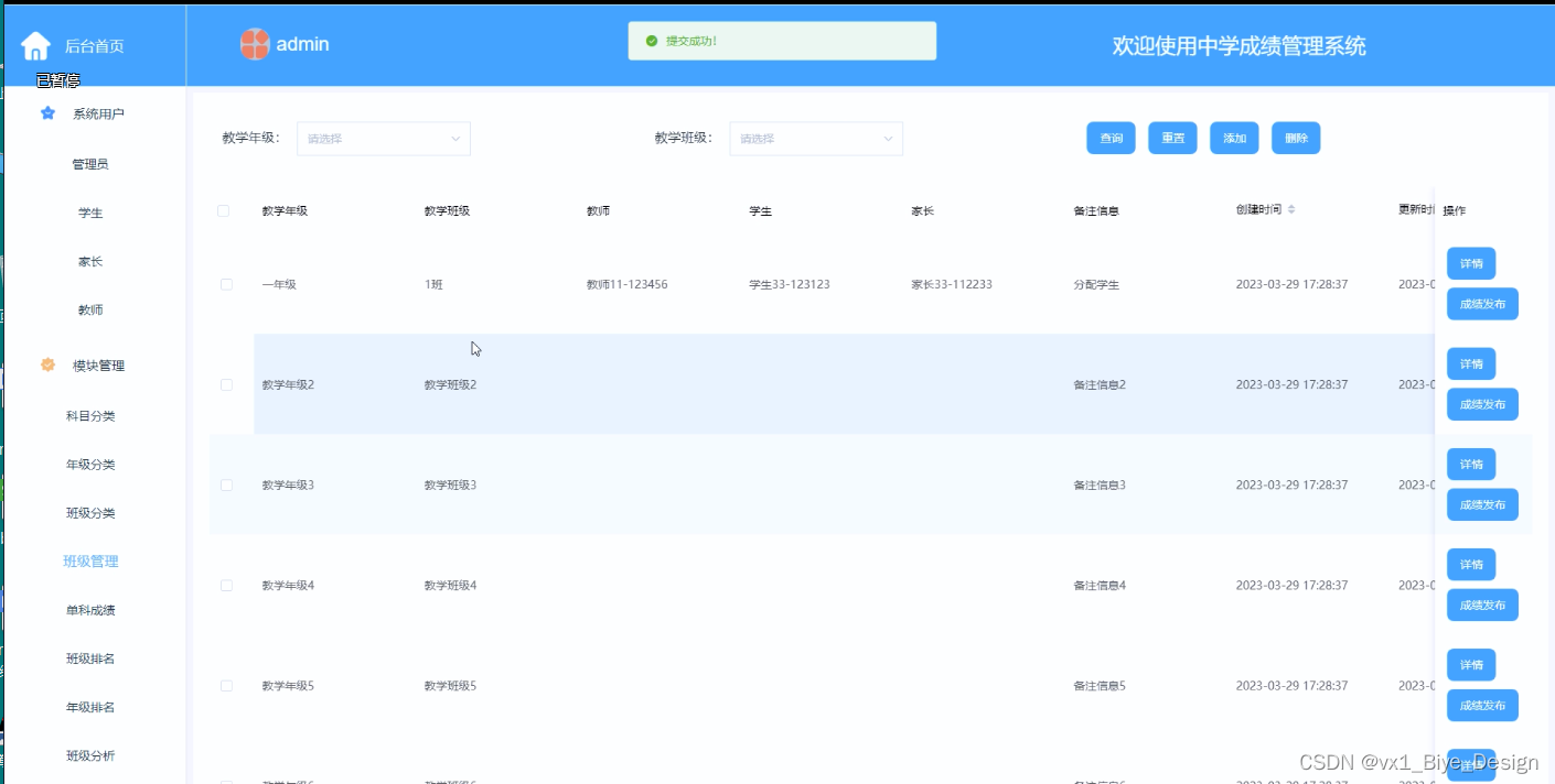 (5)班级管理:管理员点击“班级管理”会显示出所有的班级管理信息,支持输入教学年级或者教学班级对班级管理信息进行查询,如果想要添加新的班级管理信息,点击“添加”按钮,输入相关信息,点击“提交”按钮就可以添加了,同时可以选择某一条班级管理信息,点击“删除”进行删除,也可以点击后面的“成绩发布”按钮对班级管理的成绩发布信息进行维护;
