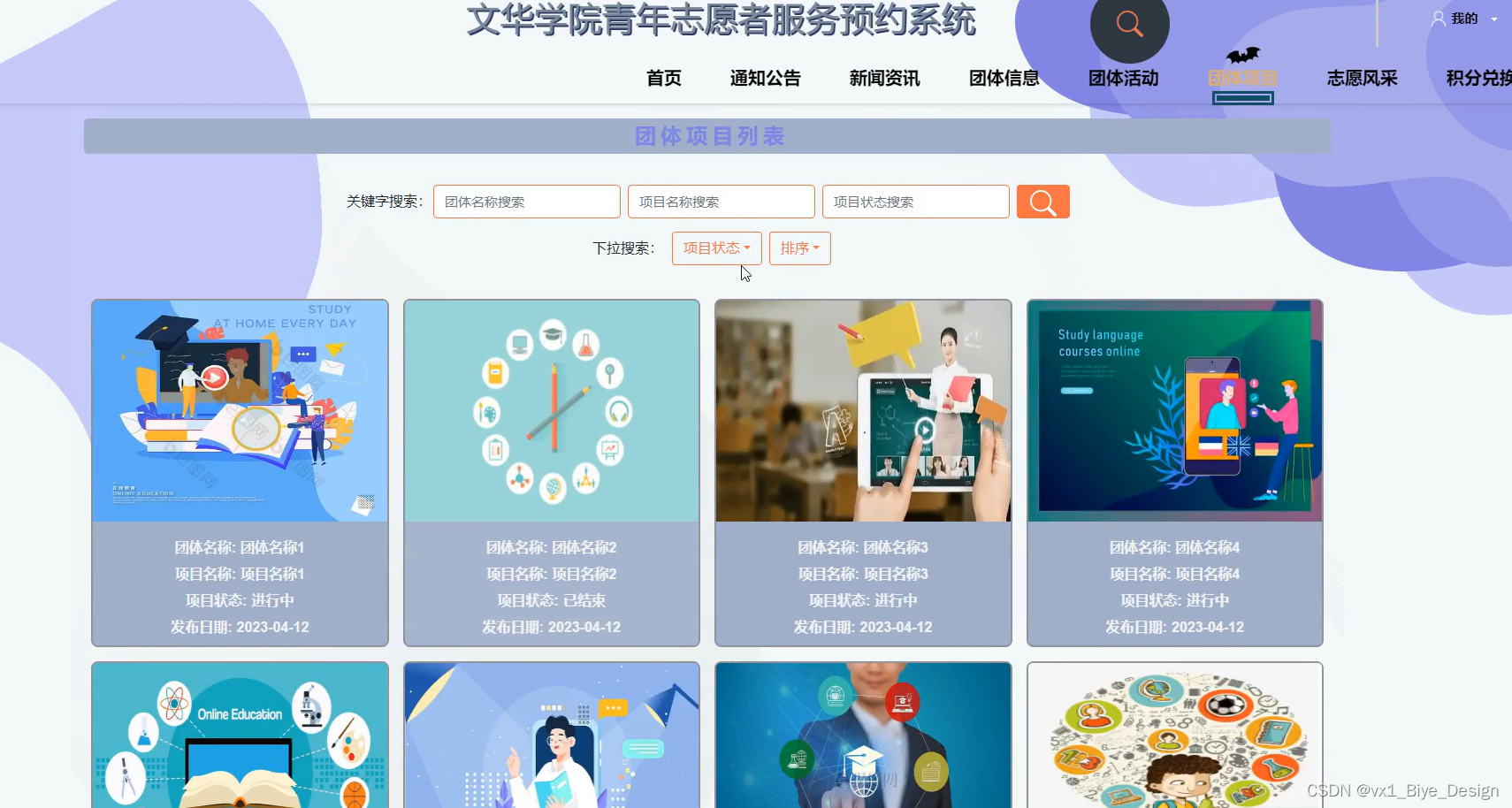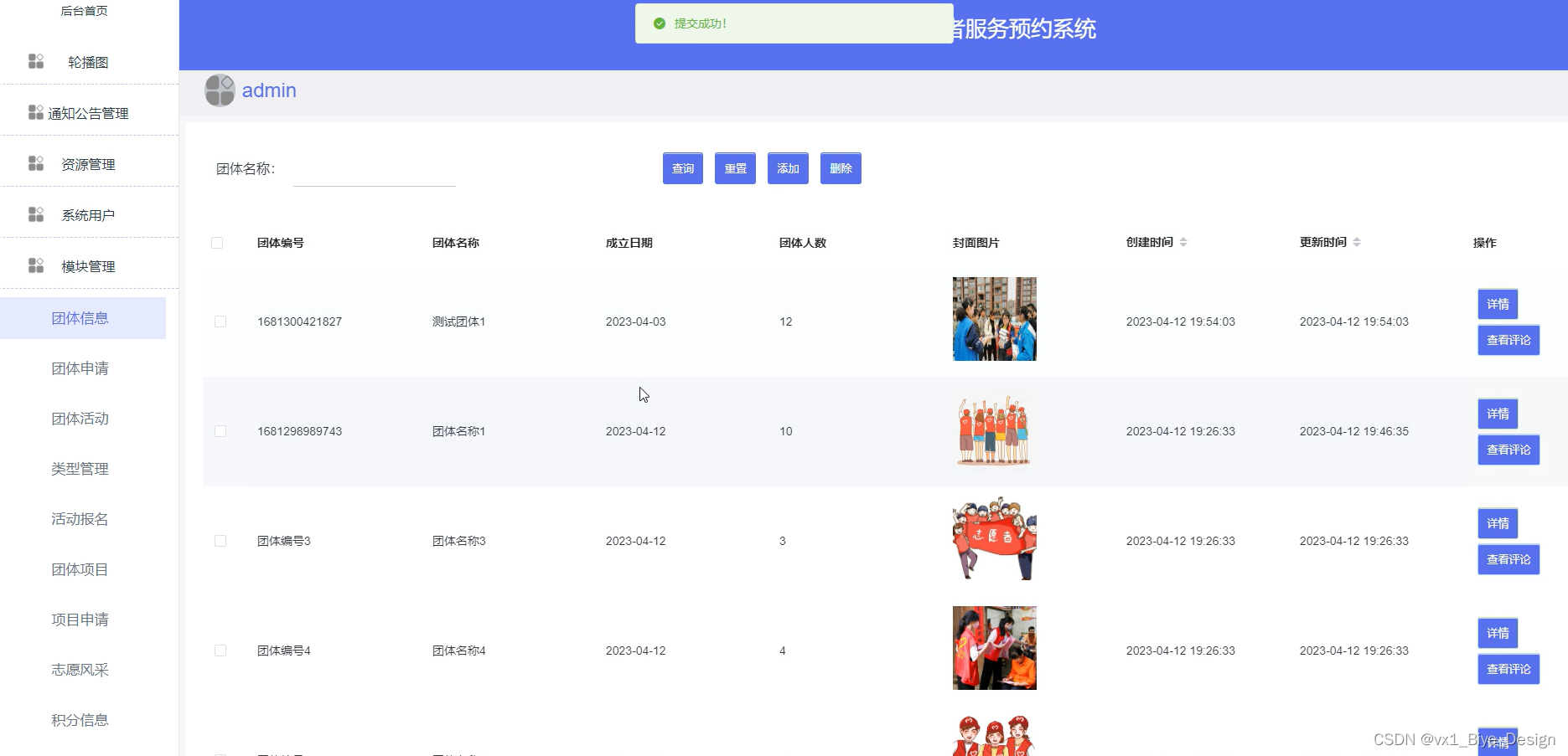 3、功能的完善性:管理员:后台首页、轮播图、通知公告管理、资源管理(新闻资讯、新闻分类)、系统用户(管理员、系统用户)、模块管理(团体信息、团体申请、团体活动、类型管理、活动报名、团体项目、项目申请、志愿风采、积分信息、积分兑换、兑换记录)模块的修改和维护操作。