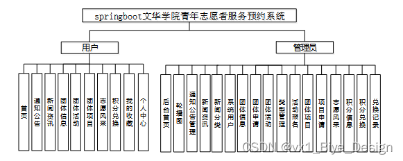 文华学院青年志愿者服务预约系统,主要的模块包括管理员:后台首页、轮播图、通知公告管理、资源管理(新闻资讯、新闻分类)、系统用户(管理员、系统用户)、模块管理(团体信息、团体申请、团体活动、类型管理、活动报名、团体项目、项目申请、志愿风采、积分信息、积分兑换、兑换记录);用户:首页、通知公告、新闻资讯、团体信息、团体活动、团体项目、志愿风采、积分兑换、我的(我的账户、我的收藏、个人中心)等功能。系统中管理员主要是为了安全有效地存储和管理各类信息,还可以对系统进行管理与更新维护等操作,并且对后台有相应的操作权限。