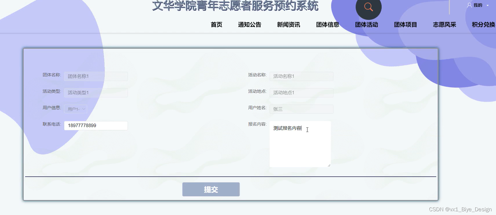 本文华学院青年志愿者服务预约系统采用java技术,Mysql数据库开发,充分保证了系统稳定性、完整性。