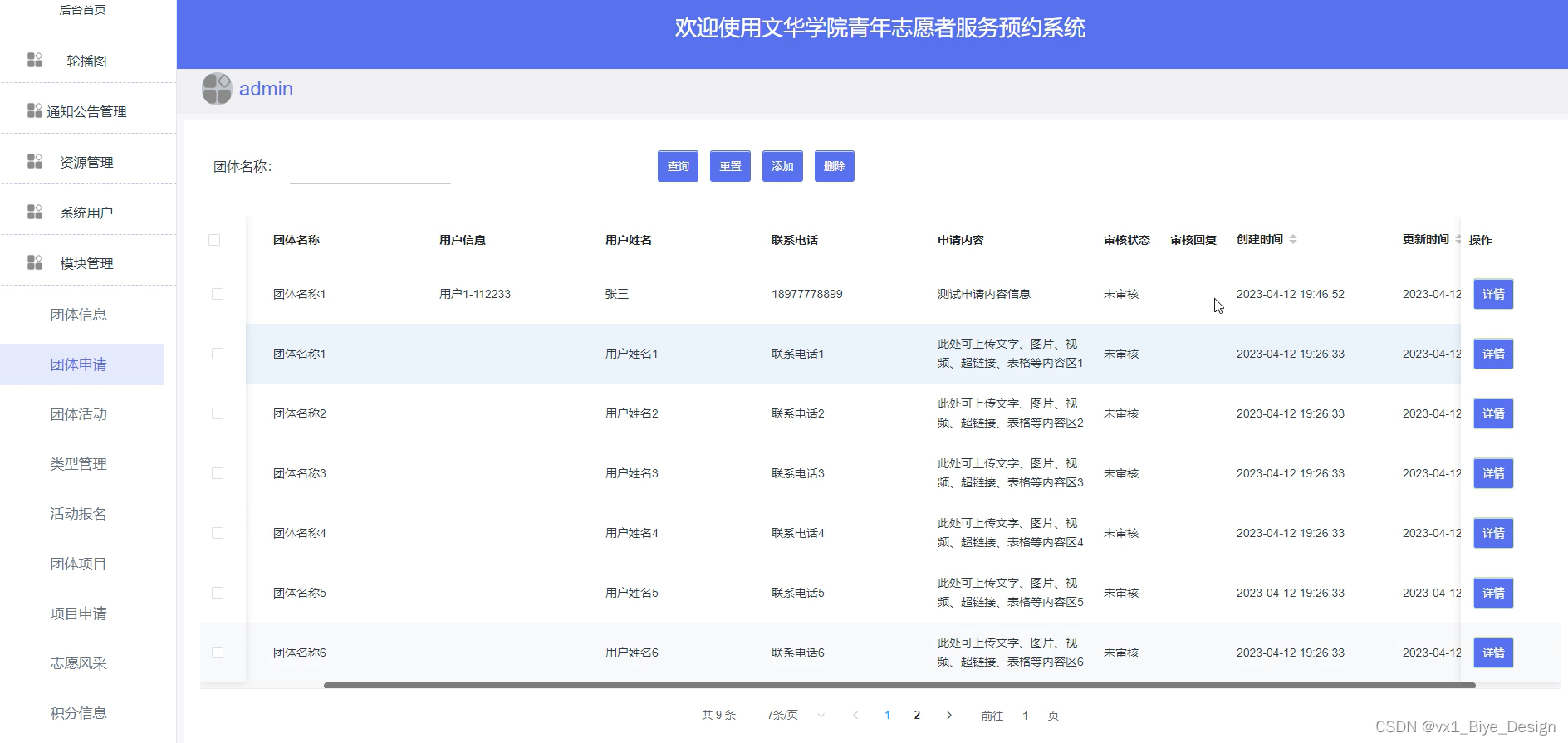 团体申请,在团体申请页面可以查看团体名称、用户信息、用户姓名、联系电话、申请内容、审核状态等信息进行查询、重置、添加、删除等操作,如图5-5,5-6所示。