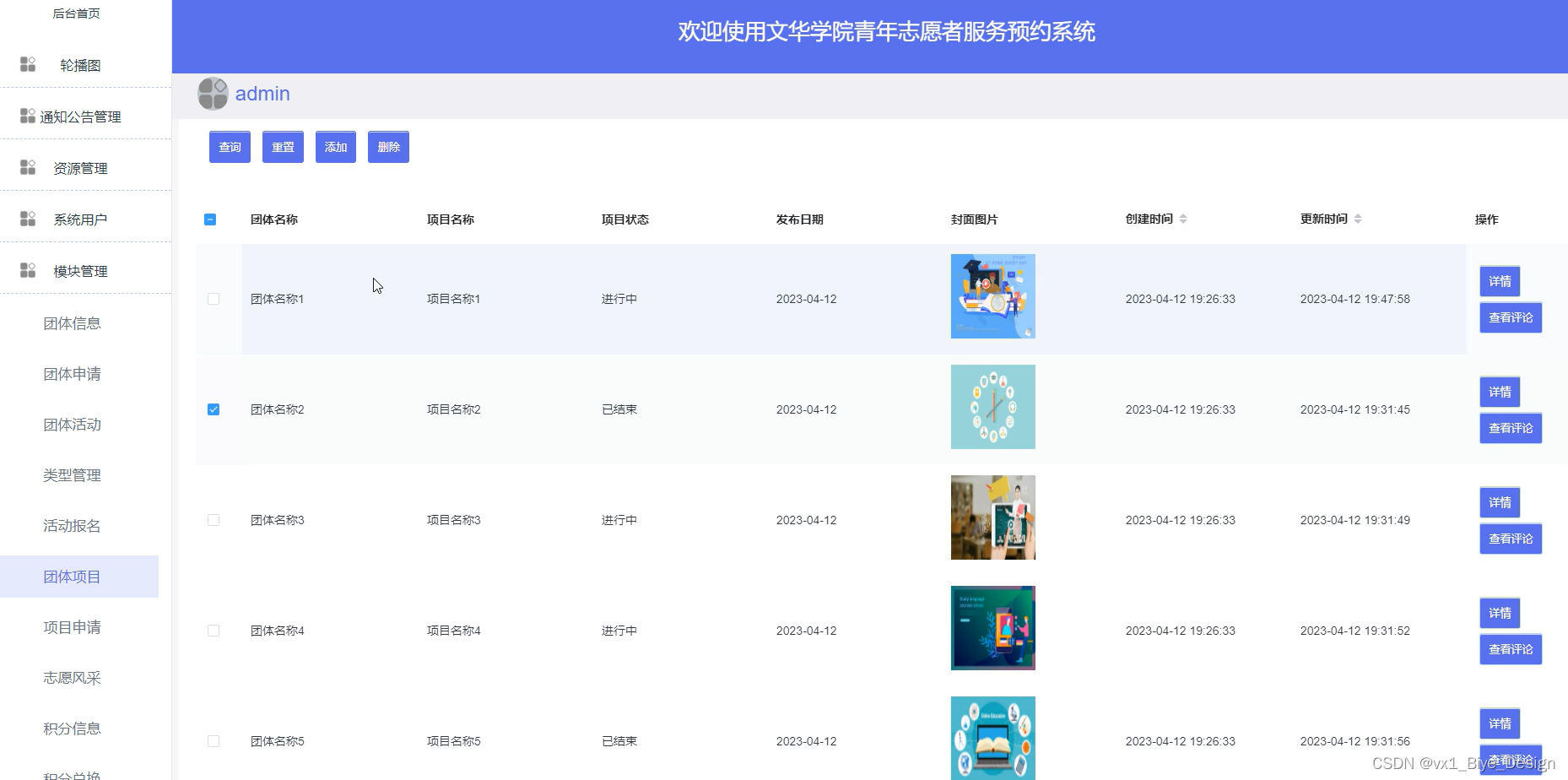 团体项目,在团体项目页面可以查看团体名称、项目名称、项目状态、发布日期等信息进行查询、重置、添加、删除等操作,如图5-7所示。