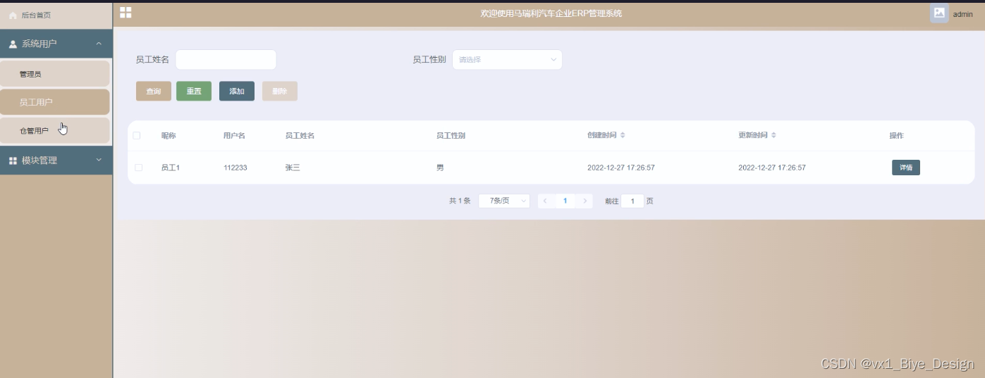 (2)系统用户管理:管理员可以对系统中所有的用户角色进行管控,包含了管理员、员工用户、仓管用户这三种角色,如果需要添加新的用户,点击页面中的“添加”按钮根据提示输入上用户信息,点击“提交”以后在对应的用户界面就可以查看到了,可以点击用户后面的“删除”按钮直接删除某一用户。