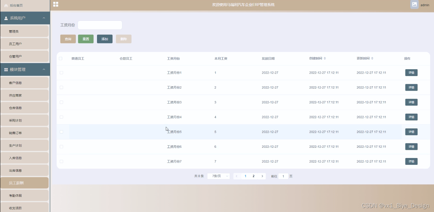 This design mainly realizes the ERP management system of Marelli Automobile Enterprise, which integrates the advantages of humanization, efficiency and convenience, and completes the system user management, customer information, supplier, warehouse information, purchase plan, sales order, production plan, warehousing information, outbound information, employee compensation, attendance and vacation and other functional modules. The system communicates with the server through the browser to realize data interaction and change. The system improves work efficiency and reduces errors and omissions in data storage through scientific management and convenient services. The ERP management system of Marelli Automobile Enterprise uses Java language, uses springboot technology based on MVVM mode for development, and uses MyEclipse 2017 CI 10 compiler for compilation. The data mainly uses Microsoft's MySQL relational database as the data storage medium, and cooperates with HTML+CSS technology to complete the system development.