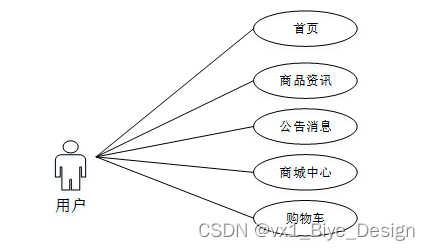 用户进入系统可以查看首页、公告消息、商品资讯、商城中心、加入购物车等操作。用户用例图如图3-1所示。