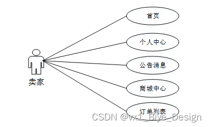 卖家进入系统可以查看首页、商城中心、订单列表等操作。卖家用例图如图3-1所示。