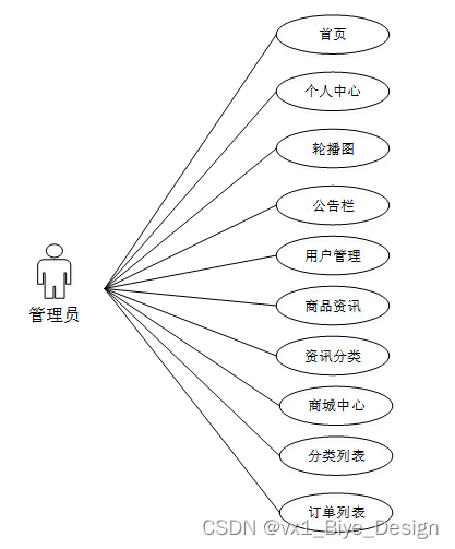 管理员登陆后,主要功能模块包括个首页、站点管理(轮播图、公告栏)用户管理(管理员、买家、卖家)内容管理(商品资讯、资讯分类)商城管理(商城中心、分类列表、订单列表)等功能。管理员用例图如图3-2所示。