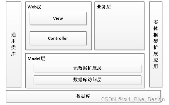 本大学生就业管理系统的架构设计主要分为可以3层,主要有Web层,业务层,Model层。其中web层还包括View层和Controller层,Model层包括元数据扩展层和数据访问层。