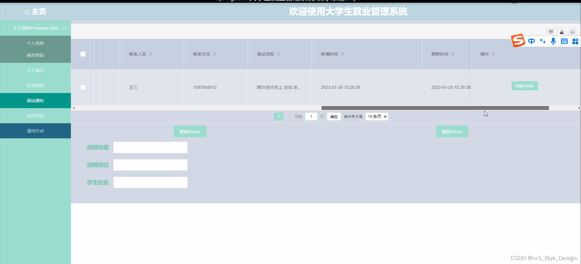 面试通知数据模块:可分为面试通知数据浏览、面试通知数据检索、面试通知数据维护三个模块,企业对面试通知数据有维护的权限,发布新的面试通知数据、更新已有的面试通知数据等。