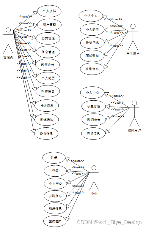 大学生就业管理系统的功能主要分为前台用户根据自己的需求进行注册登录,浏览职位信息并对选中的职位进行申请操作。后台系统管理员因职责的不同,分为普通管理员和超级管理员,普通管理员主要对申请单进行处理,而超级管理员主要对注册用户,新闻数据,职位详细信息,企业详细信息进行处理。