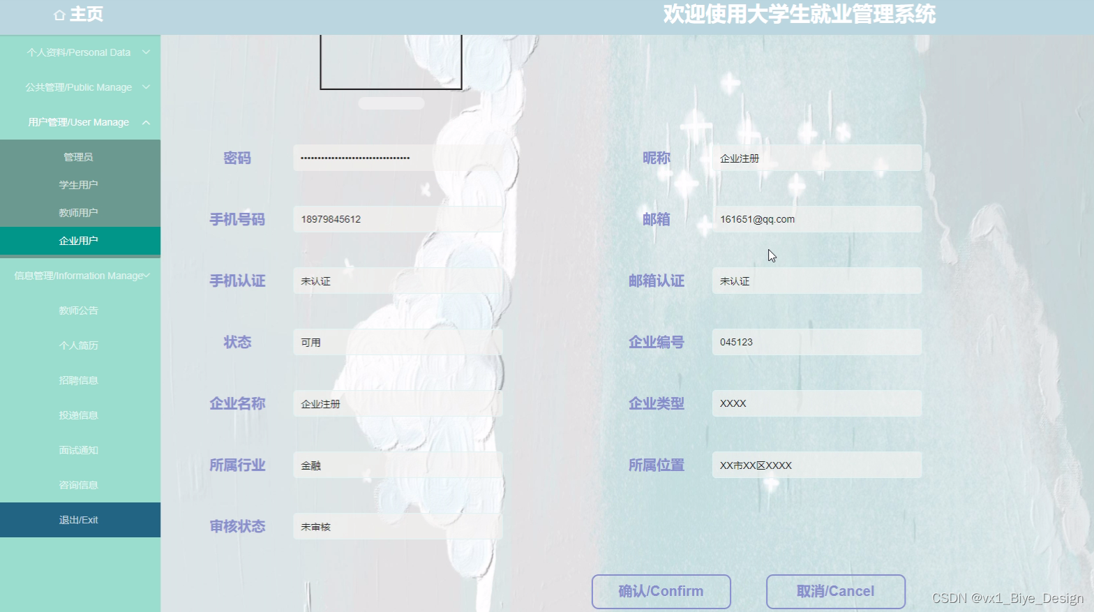 企业:存储各种企业信息。包括企业号、密码、企业名称、行业、规模、企业地址、企业照片、联系电话、联系邮箱、是否审核等数据项。