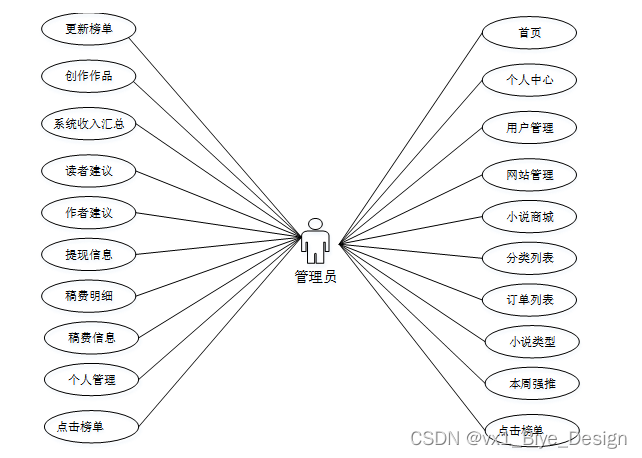 系统中的核心用户是系统管理员,管理员登录后,通过管理员菜单来管理后台系统。主要功能有:首页、网站管理(轮播图、网站公告)人员管理(管理员、读者用户、作者用户)购物管理(小说商城、分类列表、订单列表)模块管理(小说类型、本周强推、点击榜单、更新榜单、创作作品、系统收入汇总、读者建议、作者建议、提现信息、稿费明细、稿费信息)个人管理等功能。管理员用例如图3-7所示。