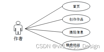 作者用户进入系统可以进行首页、模块管理(创作作品、提现信息、稿费明细)管理等。用户用例如图3-8所示。