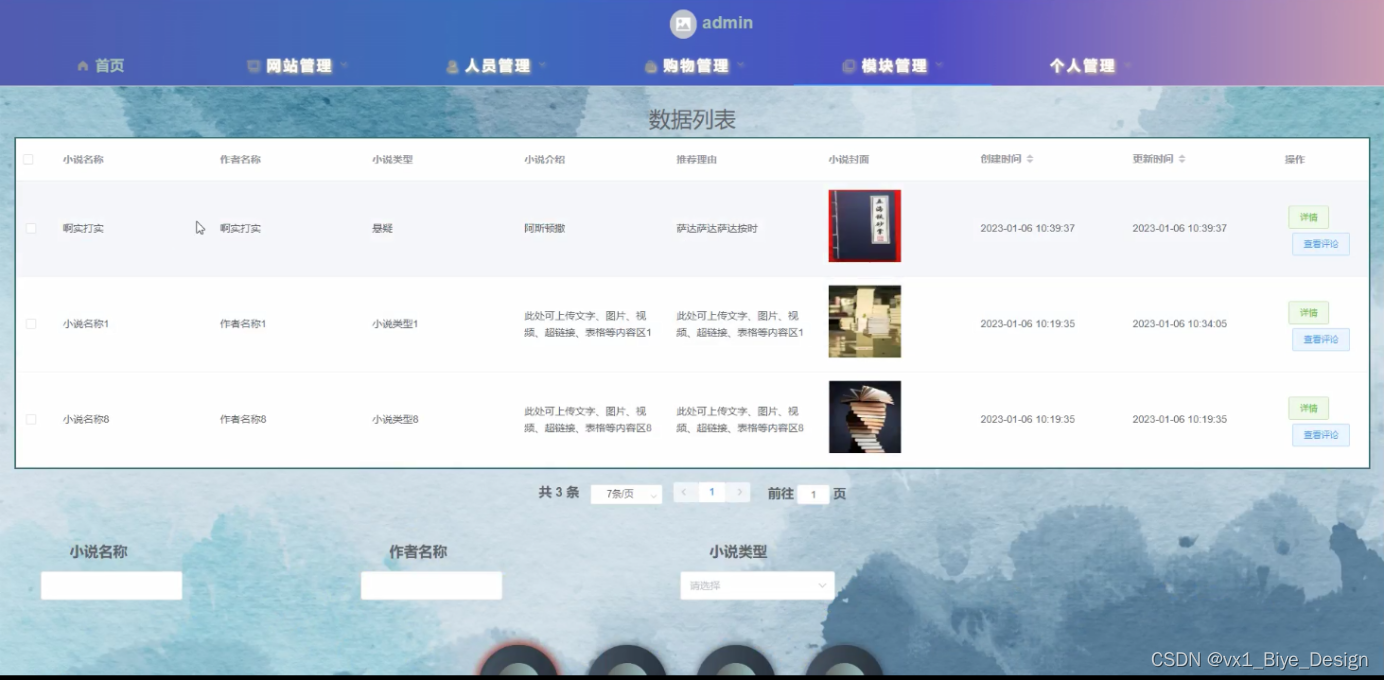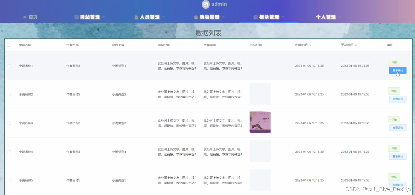 小说信息管理,在小说信息管理页面中可以查看索引、小说名称、小说分类、小说封面、小说作者、更新日期等信息,并可根据需要进行查看评论,修改或删除等操作,如图5-11所示。