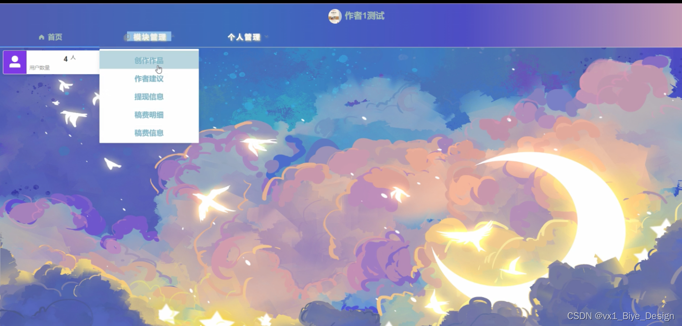 用户登录进入小说在线阅读系统可以查看首页、模块管理(创作作品、提现信息、稿费明细)等内容,如图5-13所示。