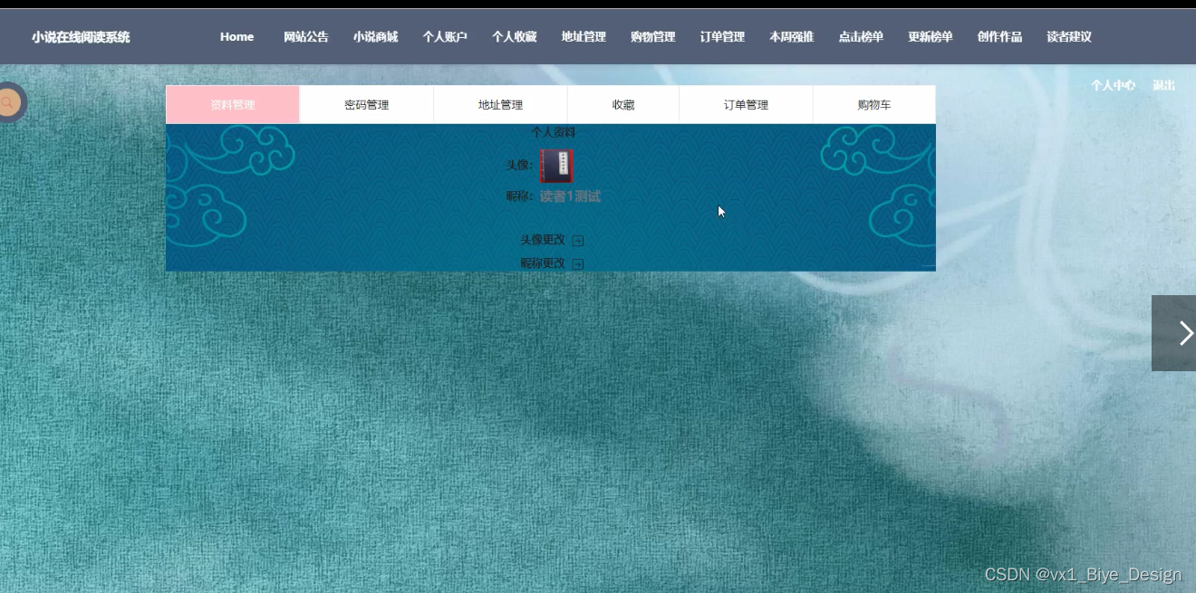 小说在线阅读系统,在系统首页可以查看首页、网站公告、小说商城、个人账户、个人收藏、地址管理、购物管理、订单管理、本周强推、点击榜单、更新榜单、创作作品、读者建议等内容,如图5-1所示。