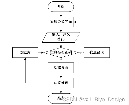 用户打开并进入系统后,会先显示登录界面,输入正确的用户名和密码,系统自动检测信息,若信息无误,则用户会进入系统功能界面,进行操作,否则会提示错误无法登录,操作流程如图3-3所示。