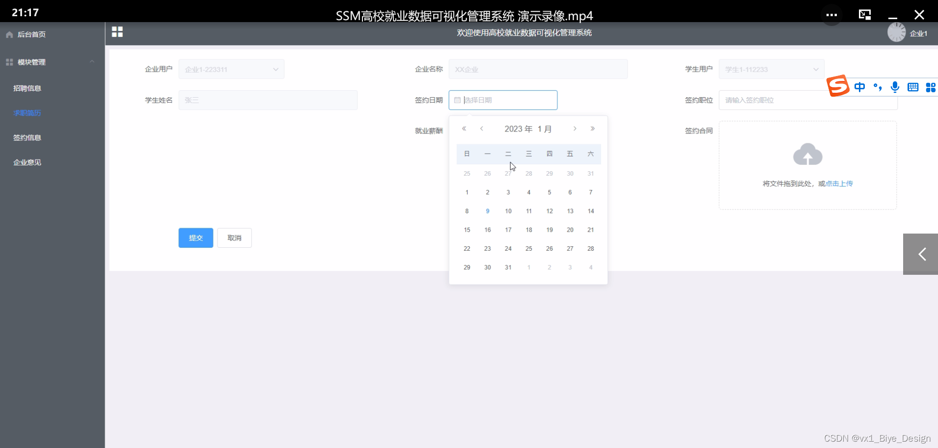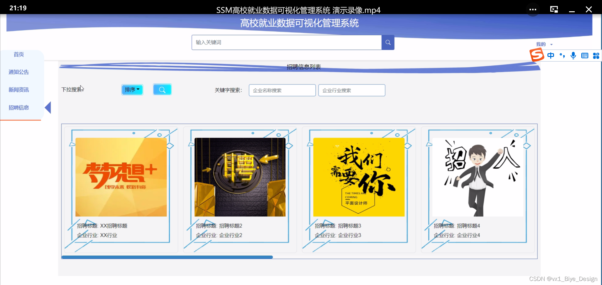高校就业数据可视化管理系统主要功能模块包括系统首页、网站管理(轮播图、通知公告)人员管理(管理员、学生用户、企业用户)内容管理(就业资讯、资讯分类)模块管理(行业管理、招聘信息、投递简历、简历信息)个人管理,采取面对对象的开发模式进行软件的开发和硬体的架设,能很好的满足实际使用的需求,完善了对应的软体架设以及程序编码的工作,采取Mysql作为后台数据的主要存储单元,采用ssm框架、echars技术、Ajax技术进行业务系统的编码及其开发,实现了本系统的全部功能。本次报告,首先分析了研究的背景、作用、意义,为研究工作的合理性打下了基础。针对高校就业数据可视化管理系统的各项需求以及技术问题进行分析,证明了系统的必要性和技术可行性,然后对设计系统需要使用的技术软件以及设计思想做了基本的介绍,最后来实现高校就业数据可视化管理系统和部署运行使用它。