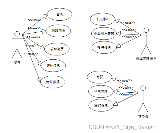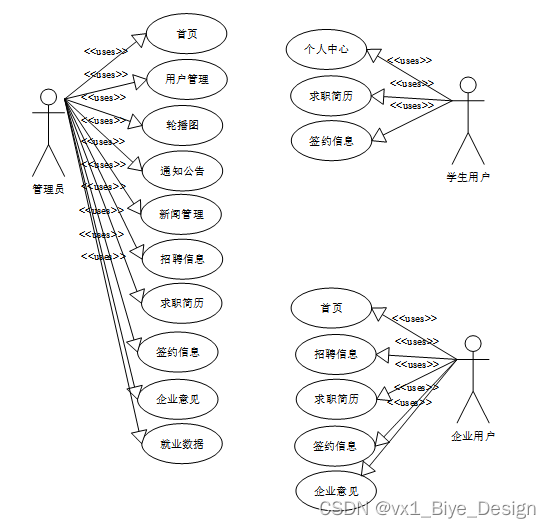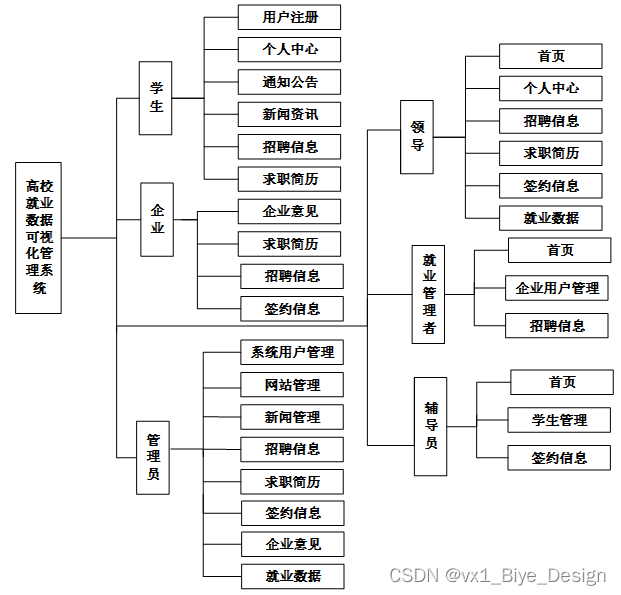 高校就业数据可视化管理系统的功能主要分为前台用户根据自己的需求进行注册登录,浏览职位信息并对选中的职位进行申请操作。管理员主要对注册用户,招聘信息、求职简历、签约信息、企业意见、就业数据进行处理。