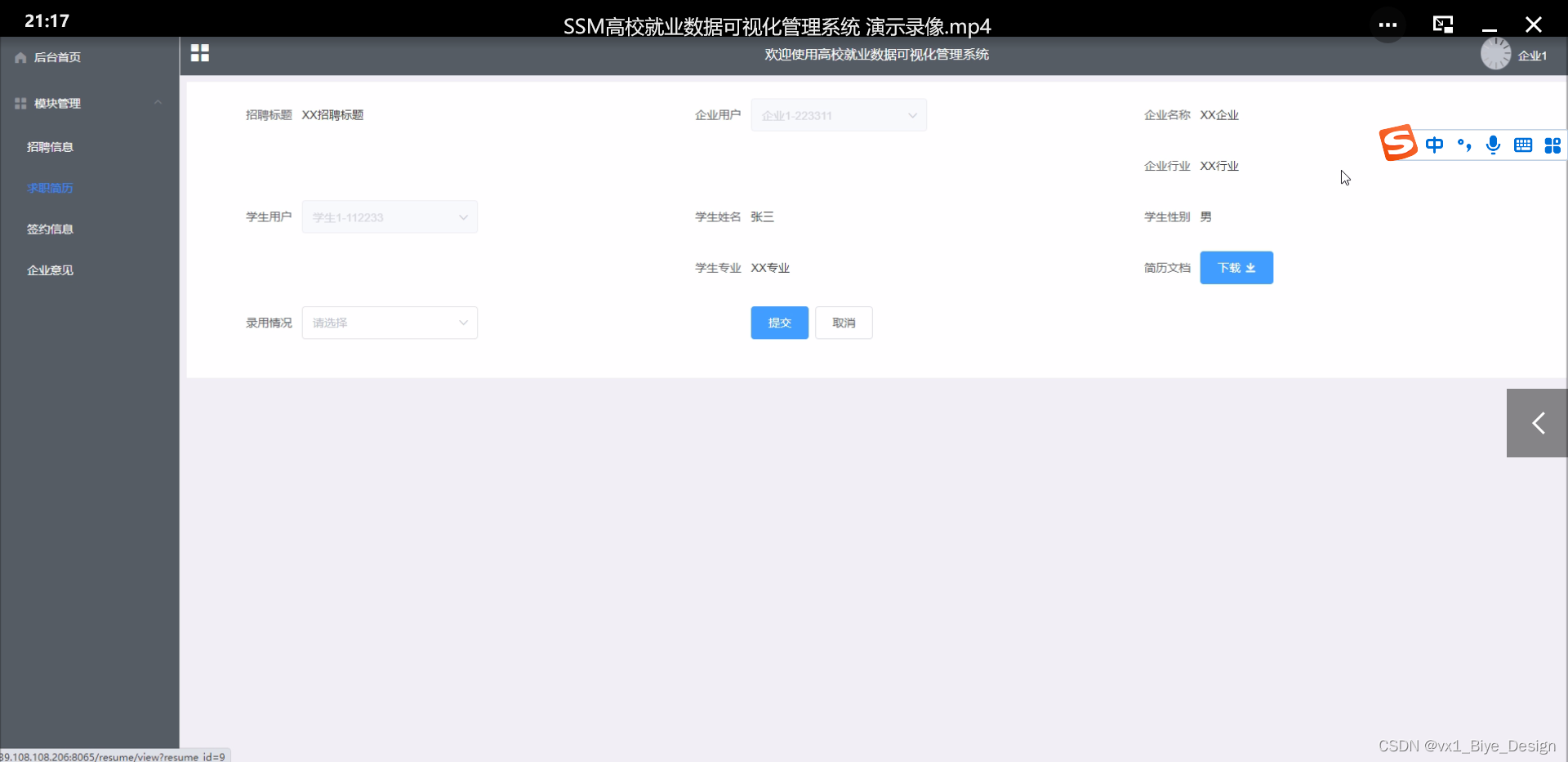 随着计算机互联网技术的迅猛发展,各行各业都已经实现采用计算机相关技术对日益放大的数据进行管理。该课题是高校就业数据可视化管理系统为核心展开的,主要是为了实现高校就业信息化管理和用户在线投递简历的需求。