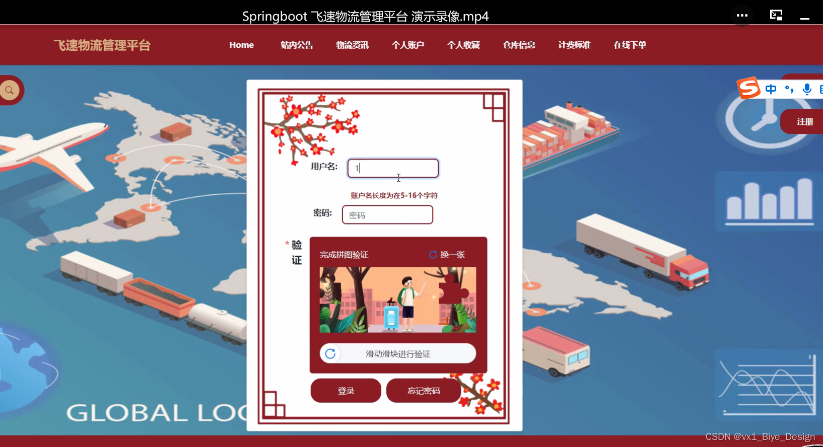 物流管理平台中的前台上注册后的用户是可以通过自己的username和password进行登录的,当会员输入完整的自己的username和password信息并点击“登录”按钮后,将会首先验证输入的有没有空数据,再次验证输入的username和password在数据库中当前保存的用户信息是否一致,只有在一致后将会登录成功并自动跳转到物流管理平台的首页中;否则将会提示相应错误信息,登录界面如下图4.3所示。