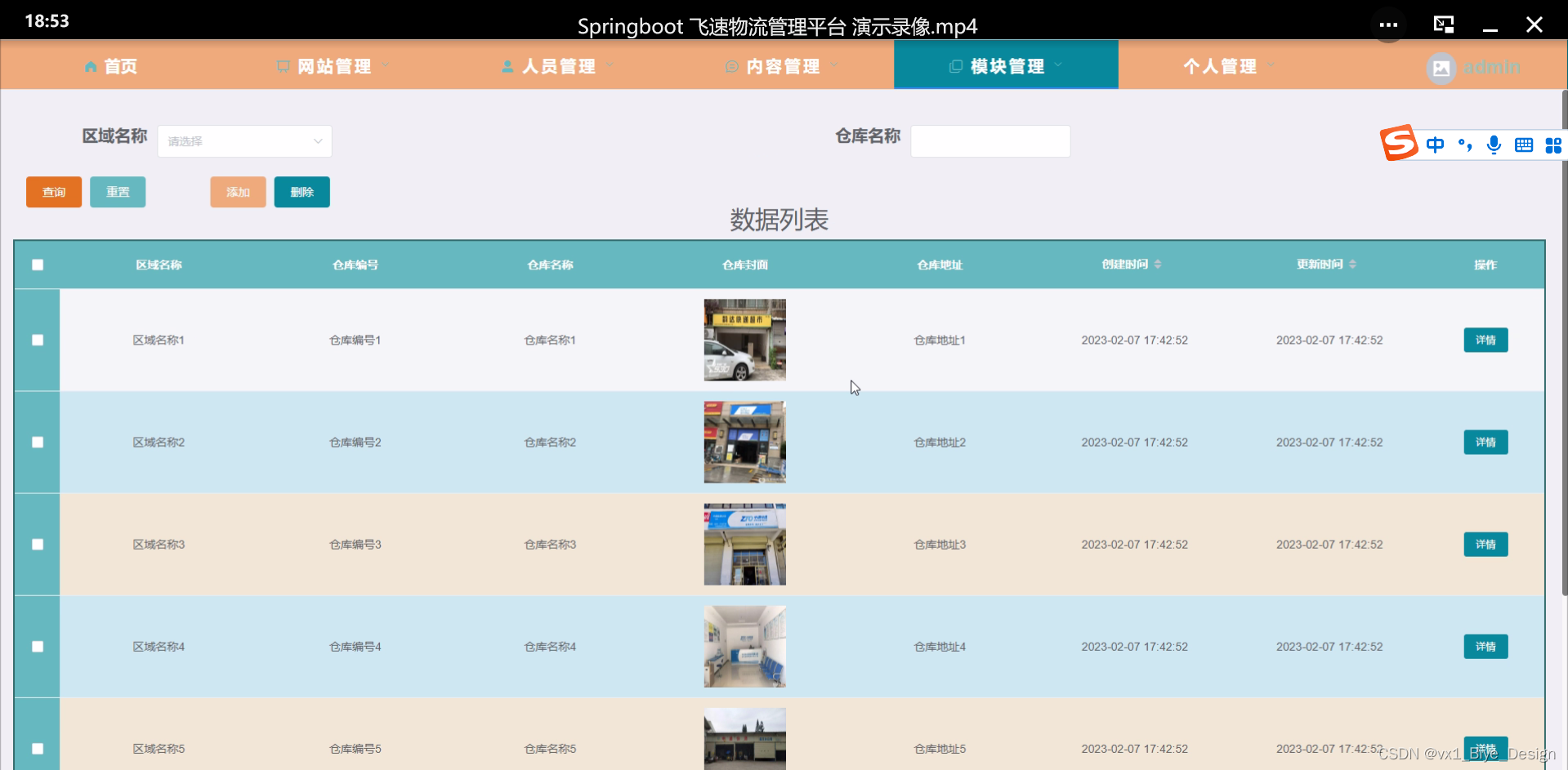 管理员点击“仓库信息”会显示出所有的仓库信息,支持输入仓库信息对仓库信息进行查询,如果想要添加新的仓库信息,点击“添加”按钮,输入区域名称、仓库编号、仓库名称、仓库封面、仓库地址等信息,点击“提交”按钮就可以添加了,同时可以选择某一条仓库信息,点击“删除”进行删除。界面如下图4.12所示。