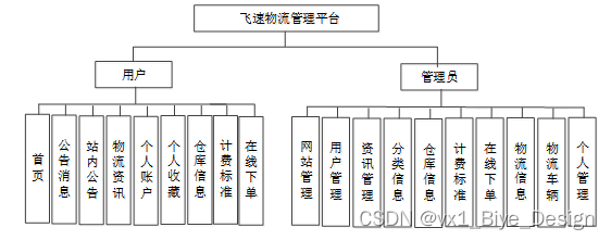 物流管理平台整体的功能模块包括管理员+注册用户两个模块,实现了对物流相关信息的查询管理,系统功能模块如图所示。