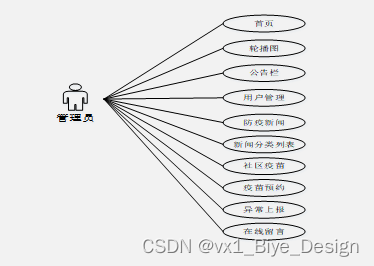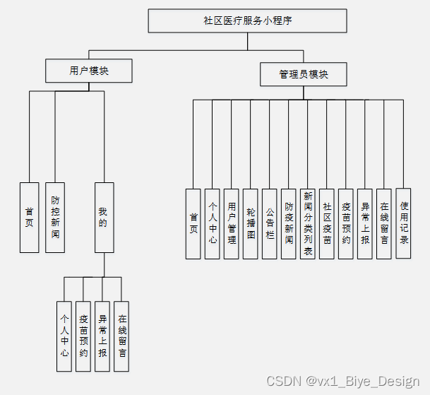 基于社区医疗服务小程序管理系统基于现有的手机,可以实现管理员:首页、轮播图、公告栏、资源管理(防疫新闻、新闻分类列表)系统用户(管理员、系统用户)模块管理(社区疫苗、疫苗预约、异常上报、在线留言)等详细的了解及统计分析。根据系统功能需求建立的模块关系图如下图: