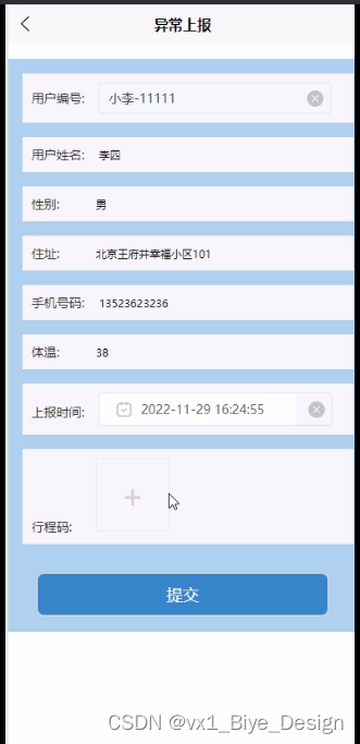 异常上报管理,在异常上报管理页面可以查看用户编号、用户姓名、性别、住址、手机号码、体温、上报时间、行程码等内容,并可根据需要进行修改或删除操作,如图5-13所示。