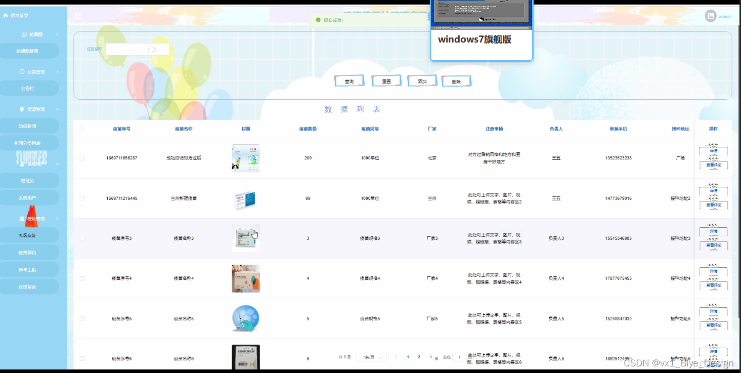 社区疫苗,在社区疫苗页面可以查看疫苗编号、疫苗名称、封面、疫苗数量、疫苗规格、厂家、注意事项、负责人、联系手机等内容,并可根据需要进行修改或删除操作,如图5-11所示。