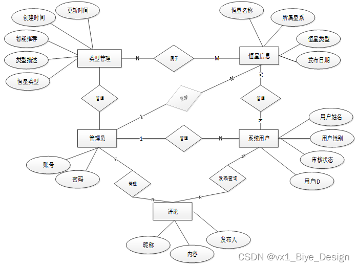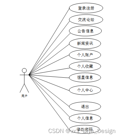 (3)确定好系统使用的技术,进行在线确认系统所划分的用户触,并且根据用户触划分确定所要设计的功能模块,对恒星科普网站的设计主要划分别为管理员和用户触,并所使用的功能模块也相应不同,但系统的数据库实现的内容是交互的,驴可以随时根据自己的需求进行健康食品信息搜索,对于系统工作人员可以根据自己的分管内容进行在线信息的处理及操作,管理员获取到所有用户的详细数据信息,并根据需求进行第一时间处理解决。