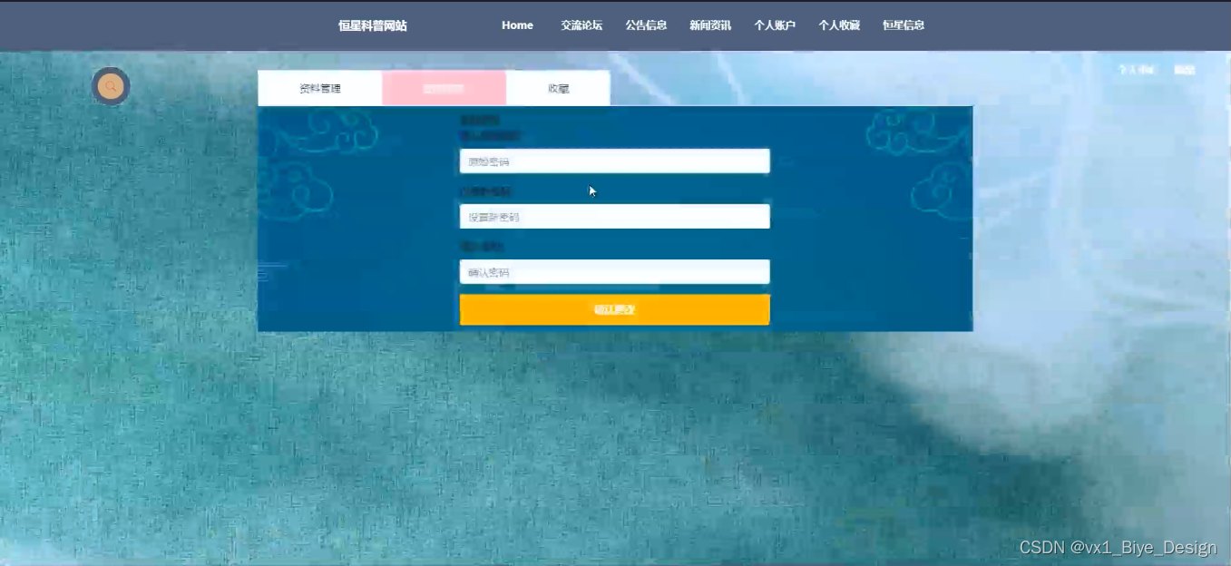 用户使用该恒星科普网站注册完成后,用户对登录密码有修改需求时,系统也可以提供用户修改密码权限。系统中所有的操作者能够变更自己的密码信息,执行该功能首先必须要登入系统,然后选择密码变更选项以后在给定的文本框中填写初始密码和新密码来完成修改密码的操作。在填写的时候,假如两次密码填写存在差异,那么此次密码变更操作失败,下面的图片展示的就是该板块对应的工作面,密码修改界面如下图4-4所示。