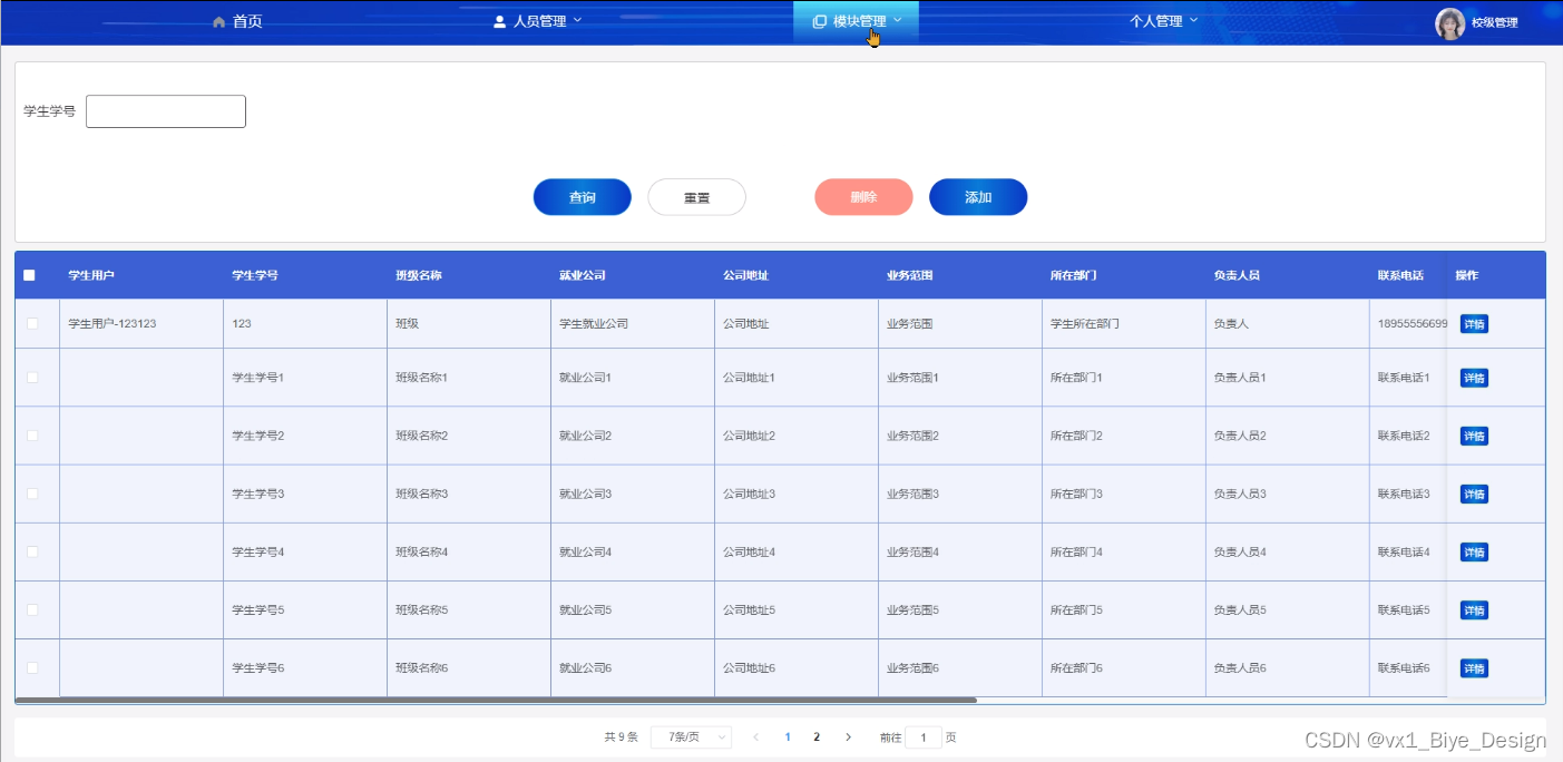 就业上报管理,在就业上报管理页面可以对学生用户、学生学号、班级名称、就业公司、业务范围、所在部门、负责人员、联系电话等内容, 根据详情进行添加、删除等操作,图5-11