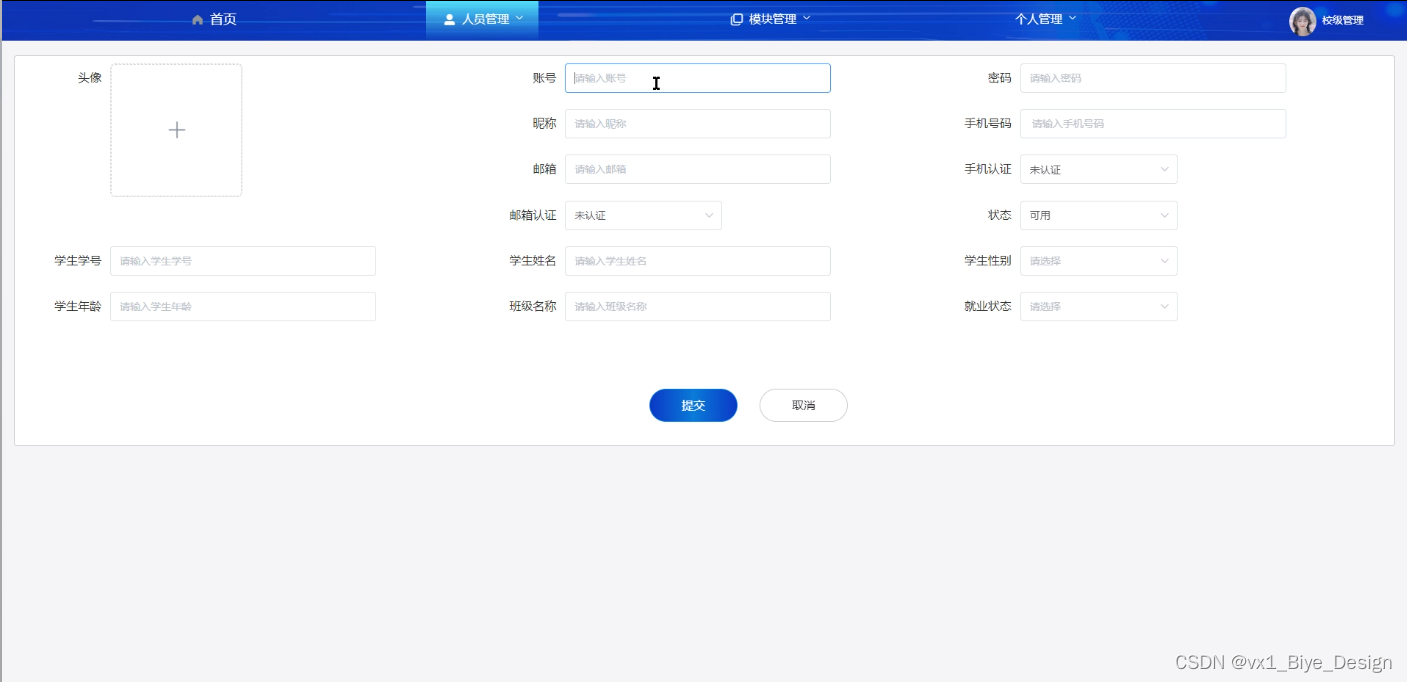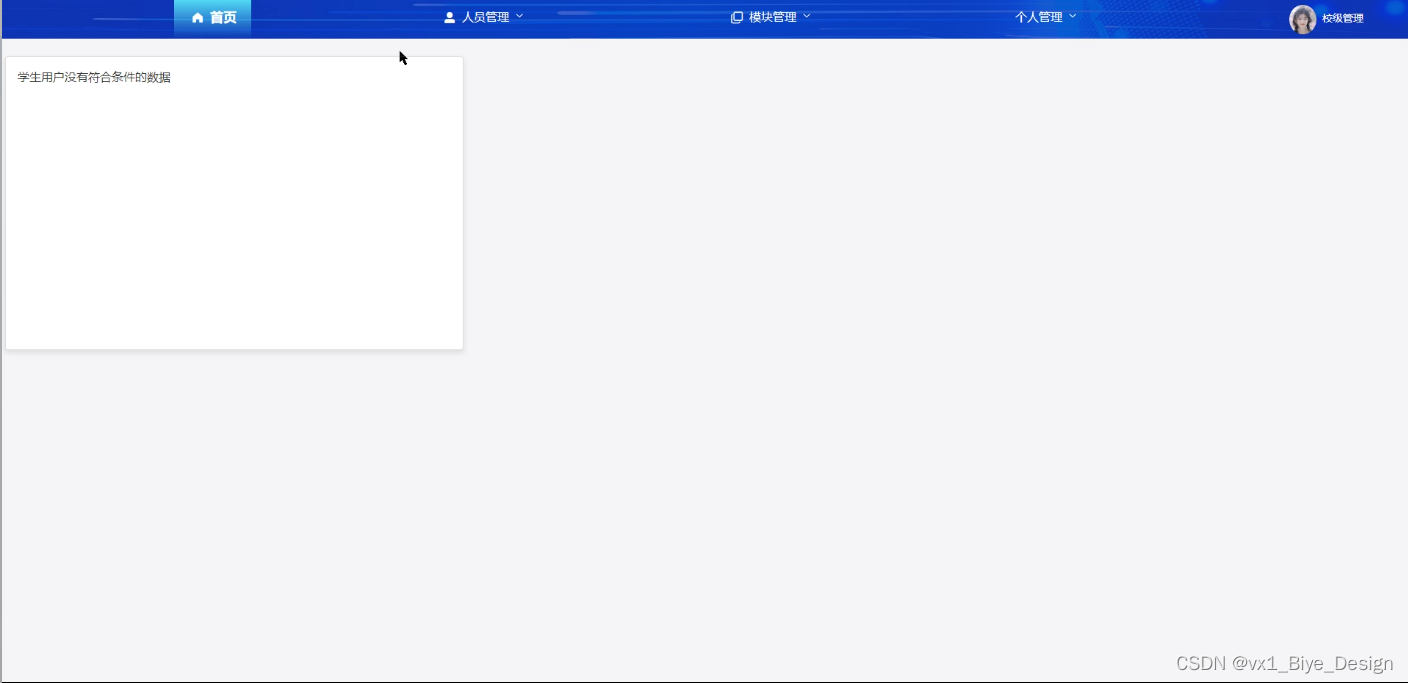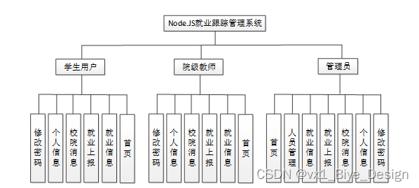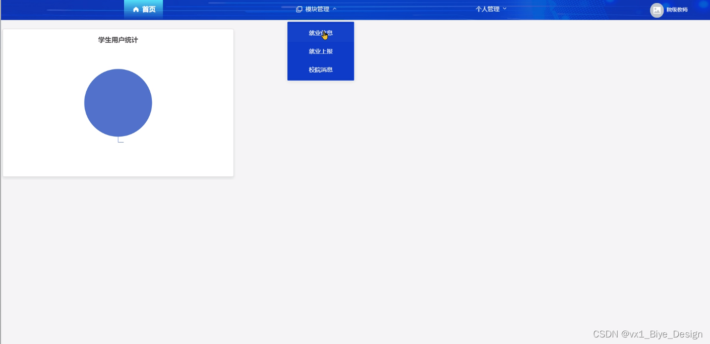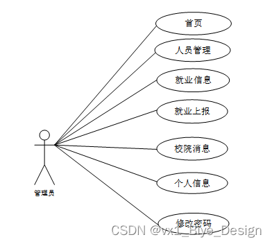 管理员功能需求:首页、人员管理(管理员、学生用户、院级教师)、模块管理(就业信息、就业上报、校院消息)个人管理(个人信息、修改密码)等。