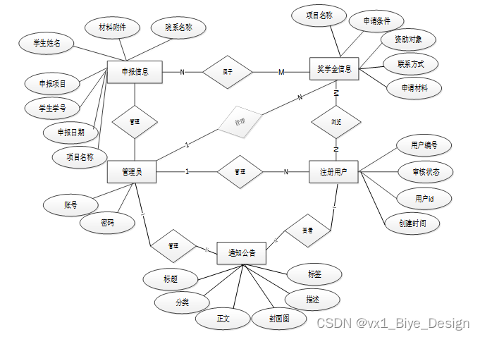对于一个要开发的系统来说,E-R图可以让别人能更快更轻松的了解此系统的事务及它们之间的关系。根据系统分析阶段所得出的结论确定了在大学生奖学金申报系统中存在着多个实体分别是用学生、管理员、奖学金、奖学金申请、。