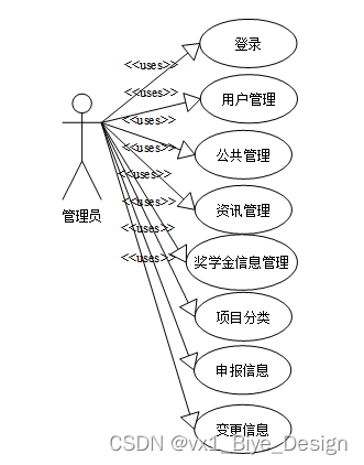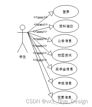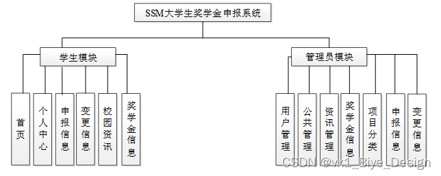 大学生奖学金申报系统在对需求做解析后,整个系统主要分为两个部分:管理员和学生,每个模块下的分支功能不一样。对功能做出如下说明:
