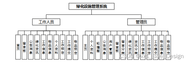 绿化设施管理系统在对需求做解析后,整个系统主要分为两个部分:管理员和工作人员,每个模块下的分支功能不一样。对功能做出如下说明: