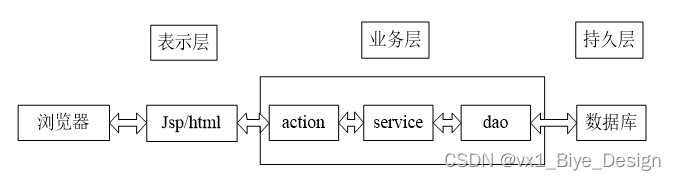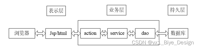 页面发送请求给控制器,控制器调用业务层处理逻辑,逻辑层向持久层发送请求,持久层与数据库交互,后将结果返回给业务层,业务层将处理逻辑发送给控制器,控制器再调用视图展现数据。
